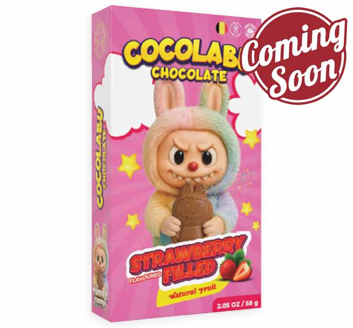 Sweet, fruity, and full of personality! The Cocolabu Strawberry Filled Chocolate Bar by Angelique Chocolate features adorable Labubu shapes made from smooth chocolate with a luscious strawberry-filled center. Creamy chocolate and bright berry sweetness come together in every bite, creating a playful treat that is as cute as it is delicious! AVAIL JUNE 2026